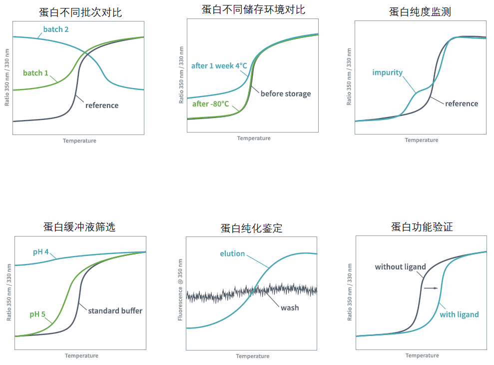 度,350nm 和􀀁330 nm 的比值被用来计算􀀁Ti 值,同时记录荧光信号初始值以及在整个实验过程中的信号变化。通过参考去折叠过程中的信号参数,快速分析蛋白样品构象变化。